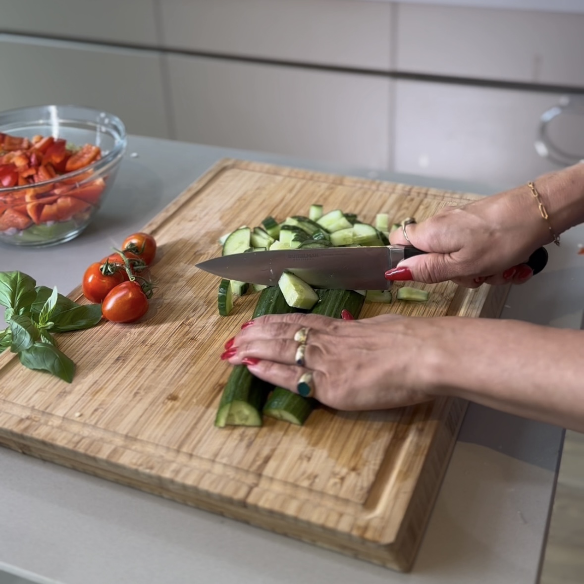 Begin met het voorbereiden van de groenten. Schil de Galia meloen, verwijder de zaden en snijd het vruchtvlees in stukjes. Snijd de rode paprika in stukken, verwijder de zaadlijsten en zaadjes. Schil de komkommer en snijd deze in grove plakken. Pel de rode ui en snijd deze in grove stukken. Pel het teentje knoflook. Doe alle gesneden groenten, inclusief de meloen, rode paprika, komkommer, rode ui en knoflook, in een grote kom.