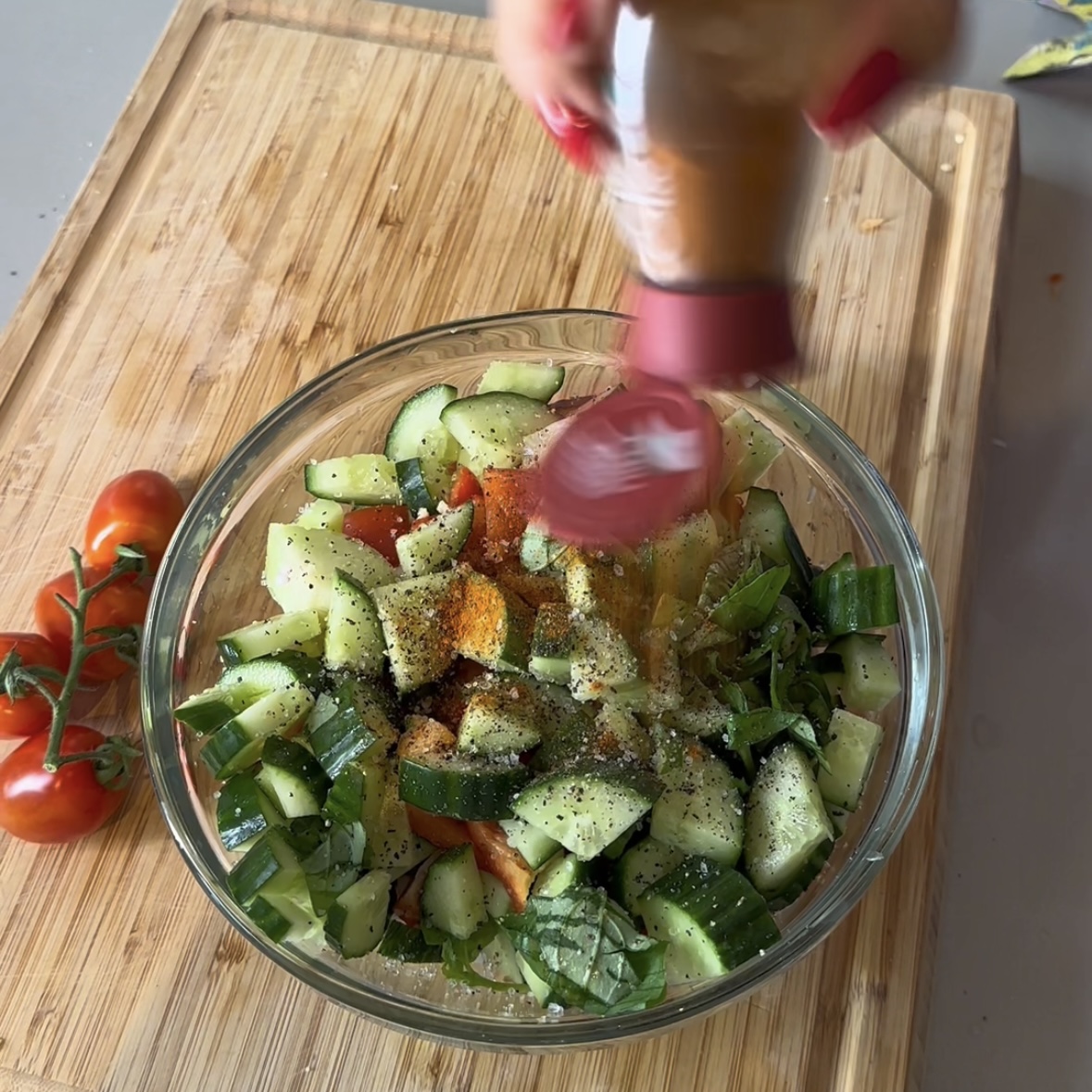 Voeg een handvol verse basilicumblaadjes toe aan de kom met groenten. Breng de gazpacho op smaak met zout, peper en chilipoeder (optioneel). Pas de hoeveelheid chilipoeder aan naar jouw smaakniveau voor een beetje extra pit. Giet een royale hoeveelheid olijfolie over de groenten in de kom.